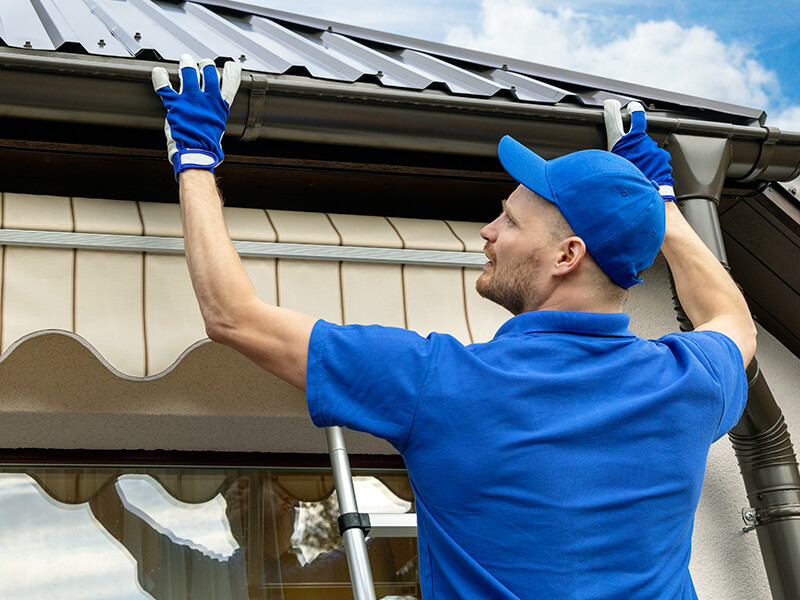 Eave flashing is required during steel roofing installation or metal roofing installation. This narrow strip of metal is attached around the eaves of the house before the roofing panels go in place. It is best to use 1 1/4-inch nails to attach this strip of metal, and it should slightly overlap where it meets the gutters if you have them.
