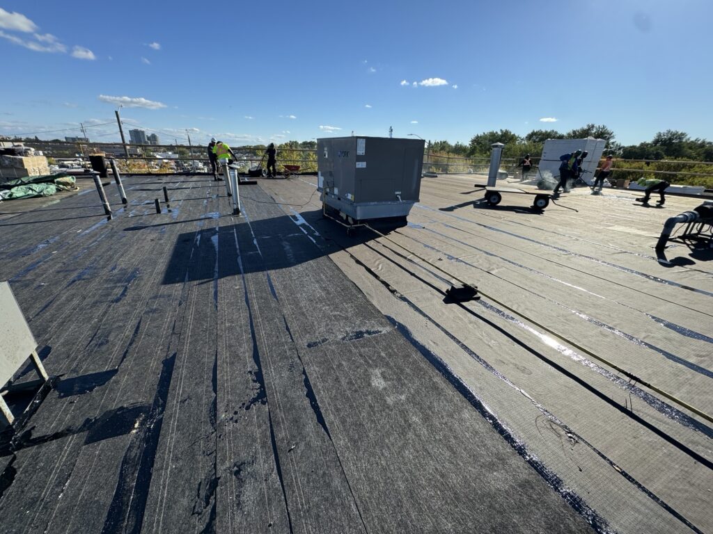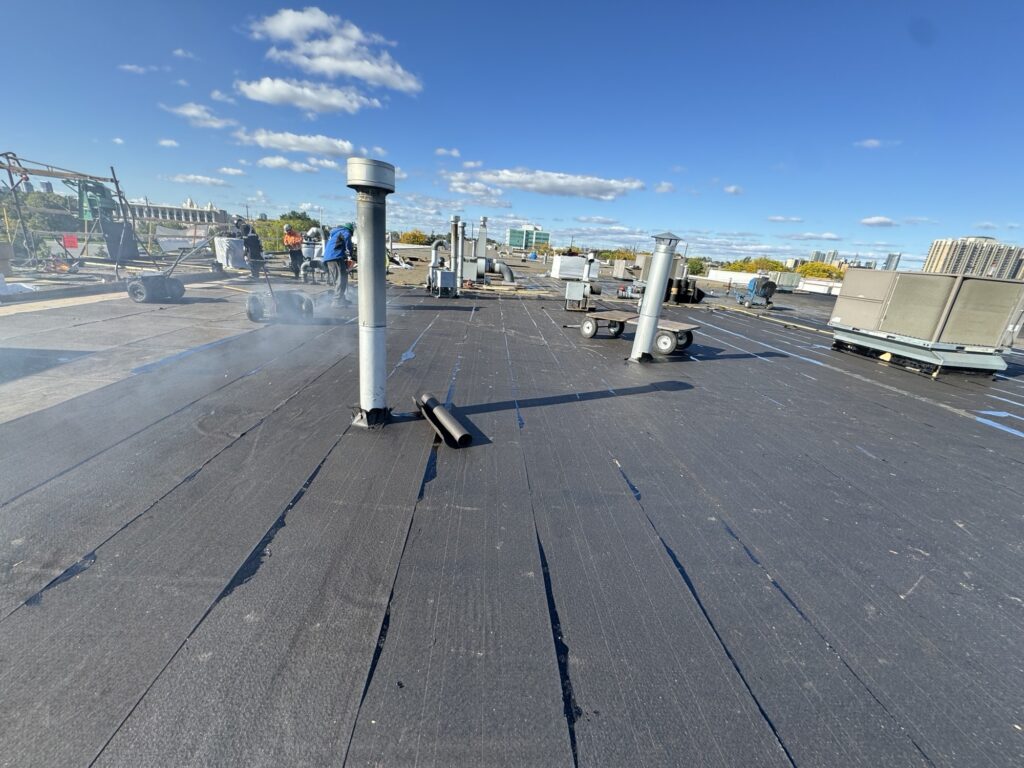 Dominion Roofing recently completed a commercial roof replacement on a busy commercial plaza in Scarborough. The existing four-ply BUR system had reached the end of its service life and was showing signs of deterioration. Our team removed the aging system and installed a new four-ply BUR roof with 2 inches of polyiso insulation to enhance thermal performance and long-term protection.