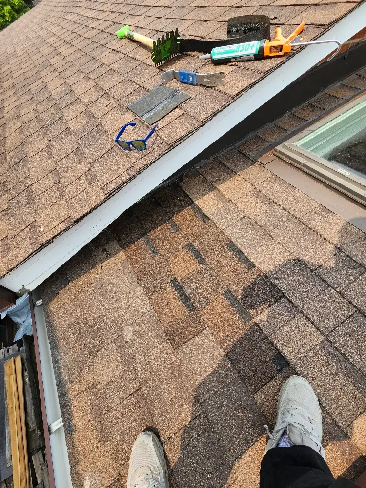 A home in Toronto required localized roof repairs to address broken shingles in several vulnerable areas. Damage was present on the upper front roof, around both skylights, and near a roof vent, creating multiple points where the roofing system could become exposed to moisture and further deterioration.