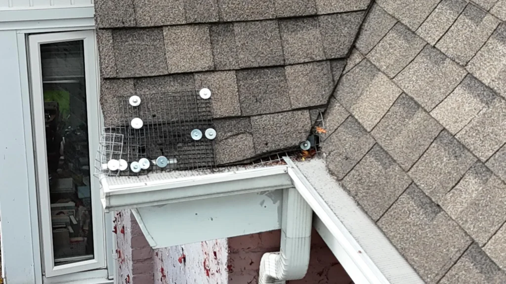 A homeowner in Toronto required several localized roof repairs after noticing damaged shingles and concerns related to previous animal activity. The existing animal mesh at the front left upper roof needed to be removed and the underlying shingles replaced. Additional shingle damage was identified on the lower left section of the roof.