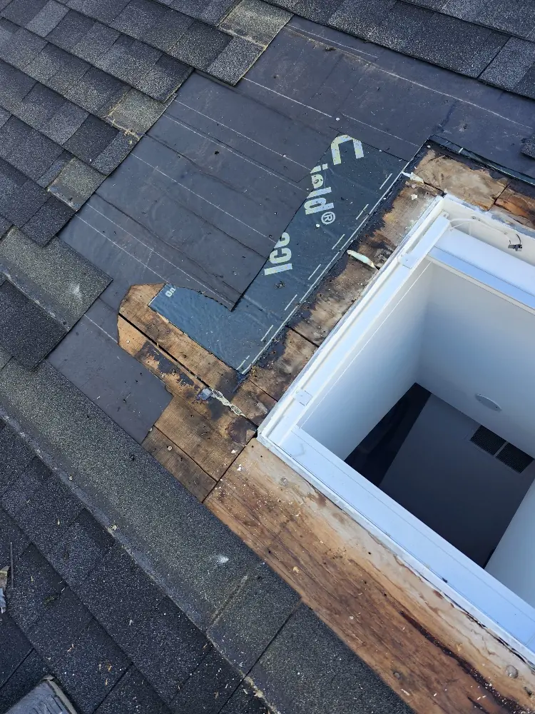 - Ice & water shield application: To protect the exposed boards and prepare the opening for a new installation, ice and water shield was applied around the skylight area.
